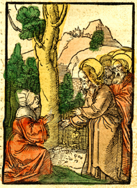 Jesus and the Canaanite woman. Artist: UNKNOWN; Date: Published 1516; Technique: Woodcut