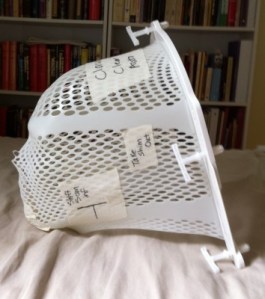 She went on to explain that for her, the most difficult aspect of the treatments was not the side effects, which she was able to manage in creative ways, but the feeling of claustrophobia that occurs while inside the machine. She described how before treatments can begin a tight-fitting mask must be made of the patient’s head – and she showed me hers, which she had brought along. She explained that the mask is made by stretching over the face and head a thin layer of moldable plastic, which is perforated so to allow for breathing. This sheet of plastic is then fitted tightly around the head and attached to the pallet upon which the patient is laying. The patient must remain motionless for fifteen minutes while the mask hardens around his or her face and head – and eyes must remain closed and mouth shut.