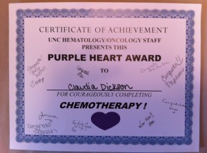 I wrote down their names and said that I would be praying for them. Once my I-V was out, a nurse presented me with a certificate celebrating the fact that I was done. Now all that was left until I was completely finished with my course of treatment was five more radiation treatments.